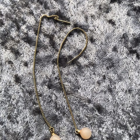 Et par elegante øreringe lavet i guld. Øreringene har en klassisk stil med smukke, hvide perler monteret. De er designet med en guld kugle, der forbinder perlerne til små stifter, der passer gennem øret. Størrelsesmæssigt er de 2 cm lange.
