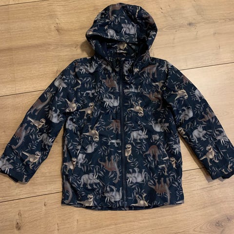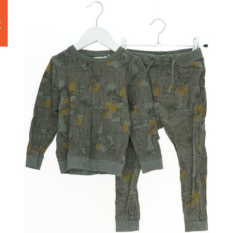 Dette er et sæt bestående af en grå trøje med lynlås og matchende bukser. Begge dele har et farverigt dinosaurprint over det hele. Trøjen har ribkanter ved ærmerne og taljen og en lynlås foran. Bukserne har en elastisk talje med snor.