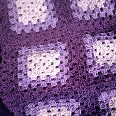 Håndhæklet tæppe i flerfarvet design med hæklede firkanter.