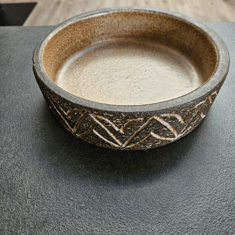 Dette er en keramisk skål med en diameter på 18,5 cm. Skålen har en mørk brun ydre med en kunstnerisk rød glasur på indersiden, der har et unikt mønstret design. Bunden af skålen fremstår i samme mørke farve som ydersiden. Skålen er mærket 'LOVE MADE GERMANY' på bunden.