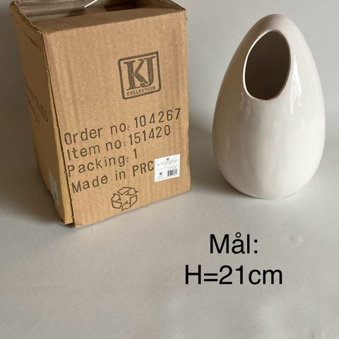 Vasen er lavet af keramik og har en højde på 22 cm. Den er hvid med grå striber og har en elegant timeglasform. Vasen har beskyttende fødder på bunden for at forhindre skader på overflader. Der er en stregkode og et mærkat på bunden med informationer om produktet.