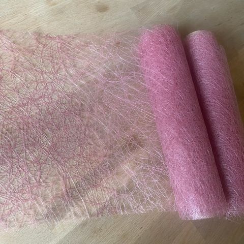 En rulle af gul bordløber, der måler 39 cm i længden. Bordløber er gennemsigtig og ser ud til at være tynd og fleksibel. Rullen har en indre kerne lavet af pap eller et lignende materiale. Velegnet flot til fx påskebordet eller konfirmation mm borddækning mm
