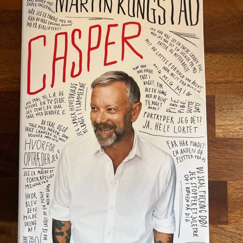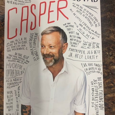 Bog om Casper Christensen. Forsiden viser titelteksten "Casper" og et portræt af Casper Christensen omgivet af håndskrevne citater. Indbundet bog velegnet til læsere med interesse for dansk komik og underholdning samt personportrætter/biografier.