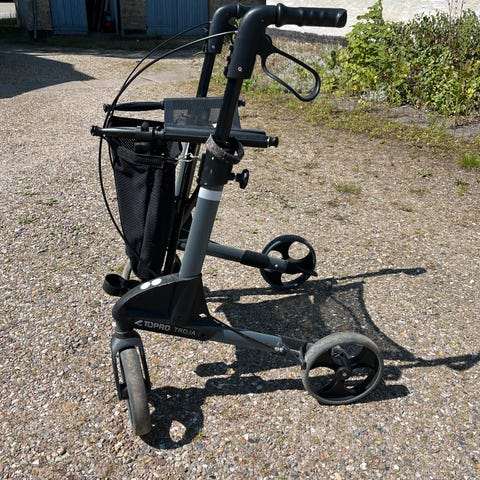 Topro Troja rollator i sort. Rollatoren har fire hjul, håndbremser og højdejusterbare håndtag. Den er sammenklappelig for nem opbevaring og transport. Udstyret med kurv/net til opbevaring af mindre ting under brug. Velegnet som ganghjælpemiddel til voksne brugere indendørs og udendørs afhængigt af underlag. brugt rollator fungerer som den skal. 300 kr. fast pris. Jeg sender ikke