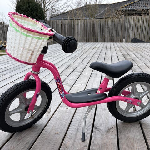 Børnecykel løbecykel med 12" hjul i cremefarvet design. Cyklen har luftfyldte dæk, lav indstigning og justerbart sæde. Styret er udstyret med en flettet kurv foran, og håndtagene har lyse greb. Sadel og stel er i matchende lyse nuancer, egnet til mindre børn, der skal øve balance og styreteknik uden pedaler.