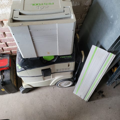 Festool CTM 26 E støvsuger til professionel brug. Model CTM 26 E med hjul og bærehåndtag for nem transport. Enheden er udstyret med betjeningspanel på fronten med drejeknapper til indstilling af sugestyrke og tilslutning af elværktøj. Medfølgende grøn/sort sugeslange monteret på toppen. Velegnet til udsugning ved elværktøj og rengøring på værksted eller byggeplads. Med poser.