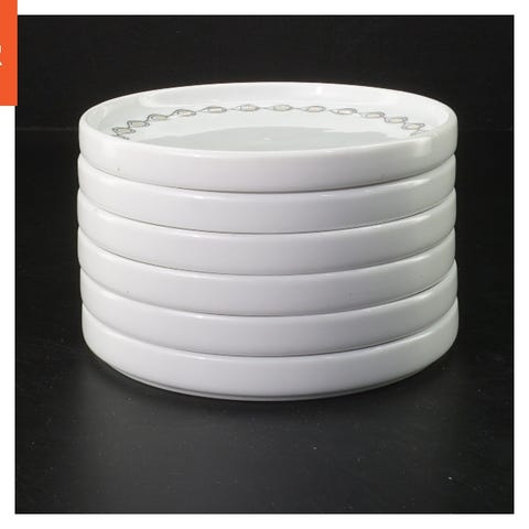 Dette er et sæt bestående af seks dekorative tallerkener, hver med en diameter på 15 cm. Tallerkenerne har et enkelt design med en stilfuld mønstret kant. De er lavet af hvidt porcelæn og har en glat finish. På bagsiden af tallerkenen er der et mærket mærke samt tekst. Velegnet til servering af mindre portioner eller som pynt. Tags: tallerken, dekoration, porcelæn