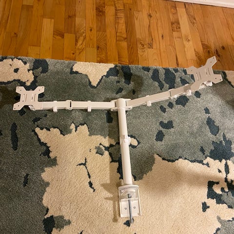 Ikke så meget at sige, spændes fast under bord, og fungere ganske fint til at holde 2 skærme :).