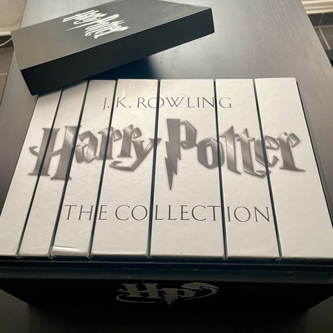 J.K. Rowling Harry Potter The Collection bogsæt. Sættet består af flere bind samlet i en sort opbevaringsboks med Harry Potter-logo. Indeni er bøgerne samlet i en hvid kassette markeret som en nummereret udgave (nr. 1589). Velegnet som komplet samling af Harry Potter-serien i ensartet design.
