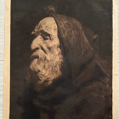 Sandsynligvis tegning fra 1800 tallet. Ramme er ældre og passepartout er rundet og buet. Indrammet uden glas. Målet på tegningen er 24 x 32 cm og rammemål 36 x 44 cm. Der er et mindre trykmærke lige indenfor passepartout øverst højre side.