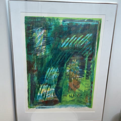Abstrakt kunsttryk billede i overvejende blå og grønne nuancer med gule og hvide detaljer. Værket er indrammet i en enkel, hvid ramme med passepartout. Motivet består af grafiske og maleriske elementer, herunder krydser og zigzag-linje. Egnet til ophæng i stue, kontor eller andre opholdsrum, hvor der ønskes et farverigt, moderne udtryk på væggen.