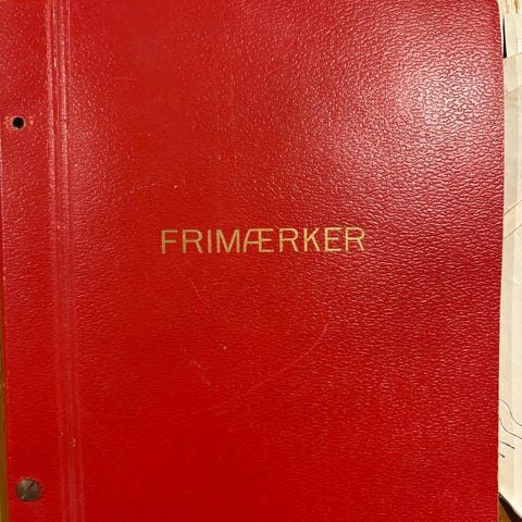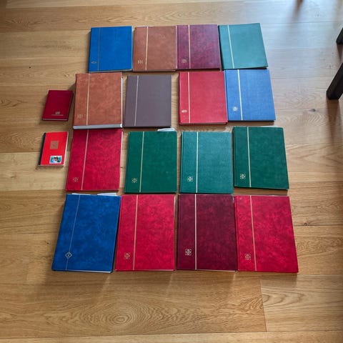 Stender frimærkealbum og øvrige samlealbum i blandede størrelser. Flere af albummerne er grønne og røde med plastlommer og fortrykte sider til montering af frimærker. Albummene egner sig til opbevaring og organisering af frimærkesamlinger og andet samlemateriale. Albummene er delvist fyldt med frimærker.
