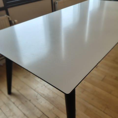 Spisebord med hvid bordplade og træben sælges. Bordpladen står stadig rigtig pæn med mindre brugstegn. Det største er et lille hak i den ene ende af pladen. Det er vist på billede 4.