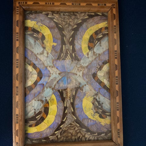 Gammel antik sommerfuglebakke ,med flotte træudskæringer og håndtag .Længde 46,5 cm,dybde 28,5 cm.afhentes i 6771 Gredstedbro eller sendes mod betaling af porto