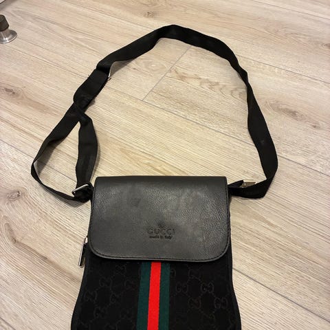 Gucci skuldertaske til kvinde i sort materiale. Tasken har et kompakt, rektangulært design med justerbar skulderrem og kædedetalje. Overfladen har præget Gucci-mønster og logo på fronten. Velegnet til hverdag og brug, hvor der er behov for plads til mindre personlige ejendele som telefon, pung og nøgler. På undersiden ses en mindre skade/slid, som bør tages i betragtning ved brug.