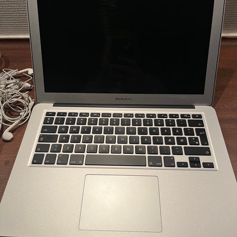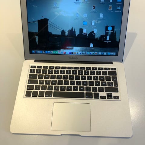 Apple MacBook Air bærbar computer med 13" skærm i sølvfarvet aluminiumskabinet. Tastatur med sort/hvide taster og stor pegeplade. Velegnet til generelt forbrug til fx studie, arbejde og hobby/fritid.