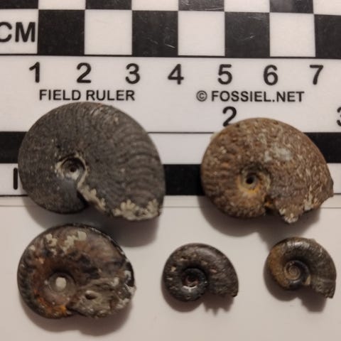 Samt en spiralformede ammonit, som også var en blæksprutte, men med spiralformet skal.