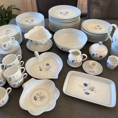 Komplet stel , kop underkop deserttallerken til 12 Pers. dog har den ene underkop få et skår ,se billede, sukkerskål , flødekande, lille fad , kaffekande samt 2 askebægere