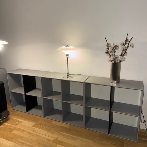2 Montana reoler sælges, 1 stk 1600 kr 2 stk 2900 kr. Farven er lysegrå (mener den hedder Fjord, og med sorte ben). 70x70x30 cm med ca 12,5 cm høje ben.