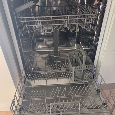 Logik opvaskemaskine i hvid. Frontbetjent model, integreret i køkkenelementer. Kontrolpanel øverst med digitale knapper og display. Velegnet til installation under bordplade i standard køkkenmodul. Passer til almindelig husholdningsbrug til opvask af service, bestik og køkkenredskaber.