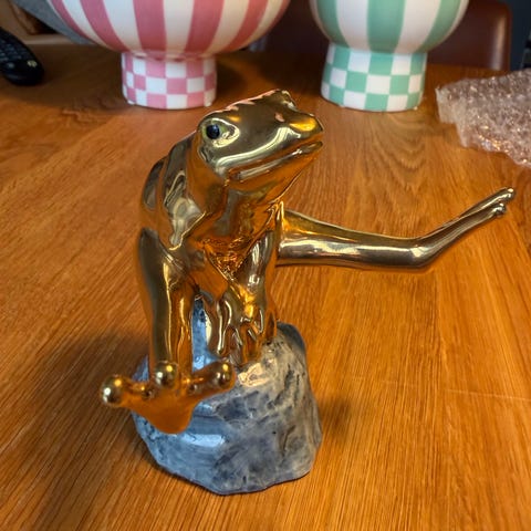 Denne figur af en platin frø, der sidder på spring på en sten er en af fire figurer i serien Good Luck Frogs fra Royal Copenhagen. Serien blev lanceret i foråret 2007, men denne figur udkom først i foråret 2008.