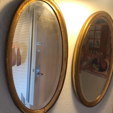2 smukke gamle ens guld spejle i oval med dekorationer langs rammen