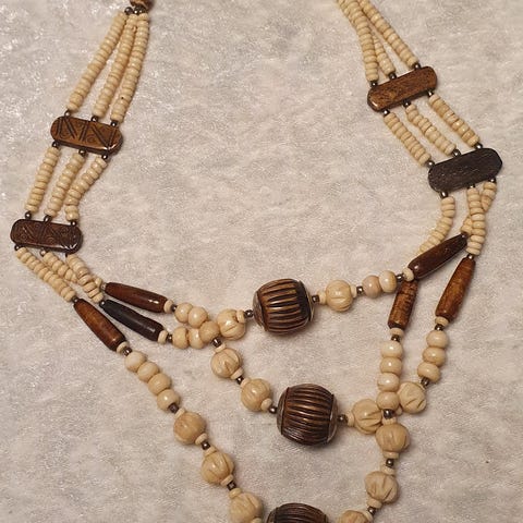 Stor halskæde med 4 lyse perlekæde og 2 sølv er i forskellige længder,