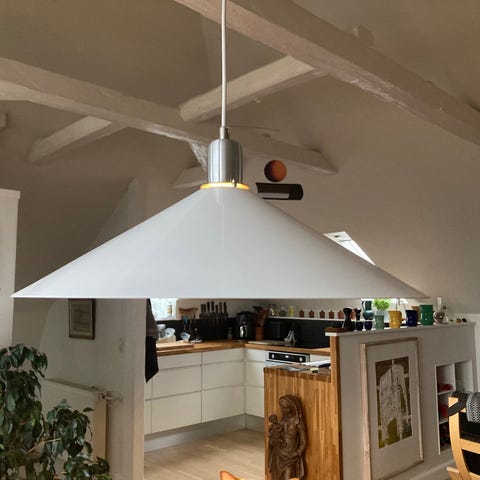 Designer Jørgen Gammelgaard Tip Top Pandul 6 i hvidlakeret metal - brugt men uden skrammer. Diameter 48 cm. Tre lamper sælges samlet for 700 kr eller 250 kr pr stk.