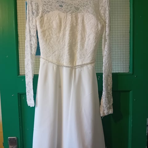 Smuk konfirmationskjole fra Sandberg, med lange blonde ærmer og simpelt fald i skørtet.