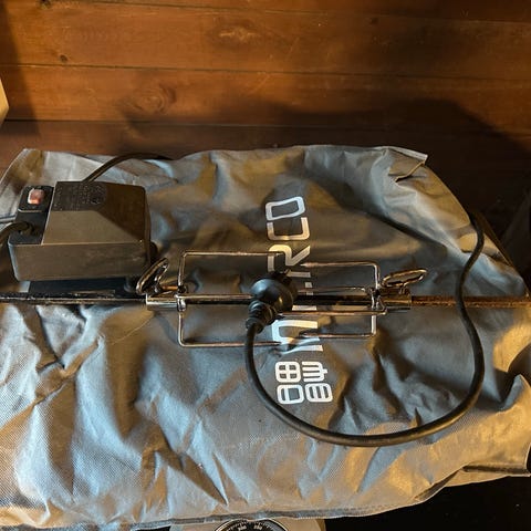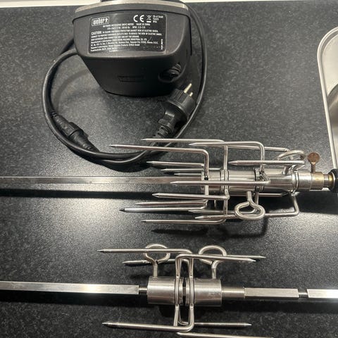 Elektrisk rotisseri spid med motor til brug på grill. Består af metalspid med justerbar holder til fastgørelse af kød eller fjerkræ samt elektrisk motorenhed med tænd/sluk-knap og stik til almindelig stikkontakt. Velegnet til montering på passende grill, hvor spiddet kan rotere kødet jævnt under tilberedning. Materiale primært metal med enkelte plastdele på motorenheden. Farve sølv/grå på spid og sort på motor.
