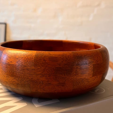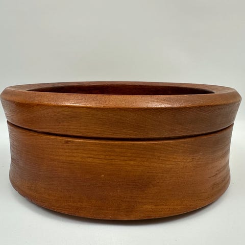Richard Nissen teaktræ skål i klassisk design fra midt 1960'erne. 12 cm høj, 22,5 cm i diameter. Den er i pæn stand med lidt slidt lak på indersiden i bunden. Skålen er drejet i massivt teaktræ med synlig årestruktur og sammensatte stave. Den har en afrundet kant og glat overflade indvendigt og udvendigt. Velegnet som serveringsskål.