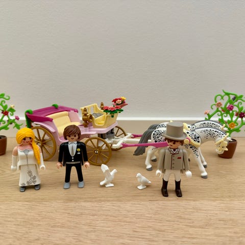 Playmobil kongelig bryllupskaret legetøjssæt i hvid med guld- og farvede detaljer. Sættet består af en hestetrukket karet med fire hjul, dekoreret med blomster og ornamenter. Medfølgende figurer forestiller blandt andet prins, prinsesse og kuske, samt to hvide heste spændt for kareten. Egnet som rolleleg og fantasileg for børn, hvor temaet er kongelige og eventyr.
