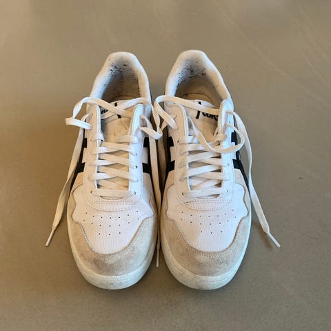 Skoene har et 90'ers techwear-look og er blevet brugt et par stykker og ser næsten ud som nye, men har nogle små siden lager, det har også en glidende sål og er let,