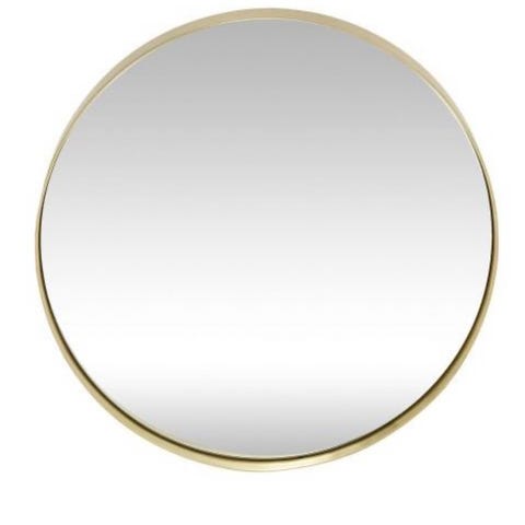 Ellos rundt spejl med guldfarvet ramme. Spejlet har en cirkulær form og en smal, metalagtig ramme i guldfarve. Bagsiden viser ophængsbeslag til montering på væg. Velegnet som vægspejl i for eksempel entré, soveværelse eller stue.