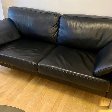 Sælger denne smukke 2 personers sofa i sort læder med 4 sorte metal ben. standen er god har mest stået til pynt!