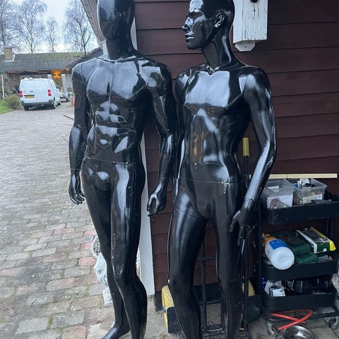 Herre mannequin helfigur i sølvfarvet finish. Kroppen er atletisk udformet med markeret overkrop og ben. Mannequinen står på rund fodplade og er velegnet til præsentation af herretøj som jakker, skjorter, T‑shirts, bukser og undertøj i butik, showroom eller udstilling. 4 stk haves og prisen er pr stk
