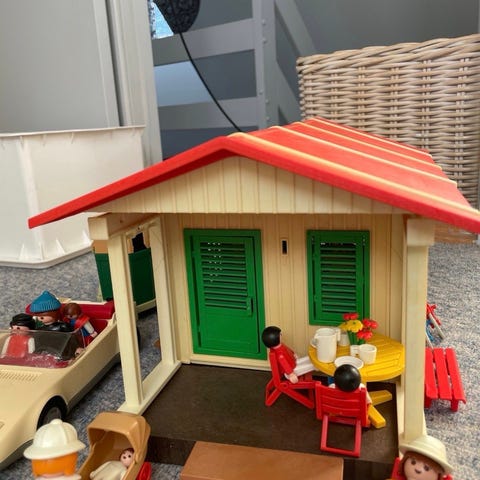 Playmobil legetøjssæt med legehus og forskellige køretøjer. Sættet indeholder et hus med åbne sider, flere Playmobil-figurer, en lille båd, en blå bil, en rund pool samt tilbehør som parasol, blomster og mindre dele. Egnet som rollelegsmiljø for børn, hvor figurerne kan placeres i hus, køretøjer og pool for at skabe forskellige hverdagssituationer og lege. Sættet består af plastdele i flere farver.