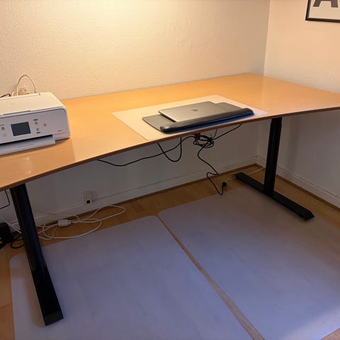 Bordet er udformet som et L, med en side på ca. 173 cm og en anden på ca. 185 cm. Den korte dybde er ca. 40 cm og den bredere del ca. 60 cm, med et buet hjørnestykke på ca. 87 cm. Højden er angivet til ca. 175 cm Bordpladen er i lyst trælook med metalben . På bordpladen ses enkelte brugsspor i form af mindre mærker. Velegnet som arbejds- eller computerskrivebord i kontor eller hjemmekontor, hvor der er behov for et hjørnebord med god bordplads.