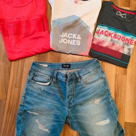 Super fin herretøjspakke str. M/L. Mange fede T-Shirts. En hættetrøje og en par bukser. Mærker som Jack and Jones og H&M.
