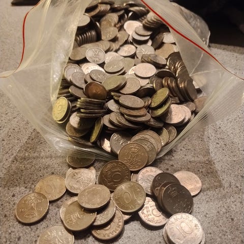 Blandede danske mønter i metal. Mønterne ligger samlet i en beholder og fremstår som en blanding af forskellige typer og værdier. Velegnet til fx samlere, dekoration eller hobbyprojekter, hvor der ønskes et større parti mønter i metal.