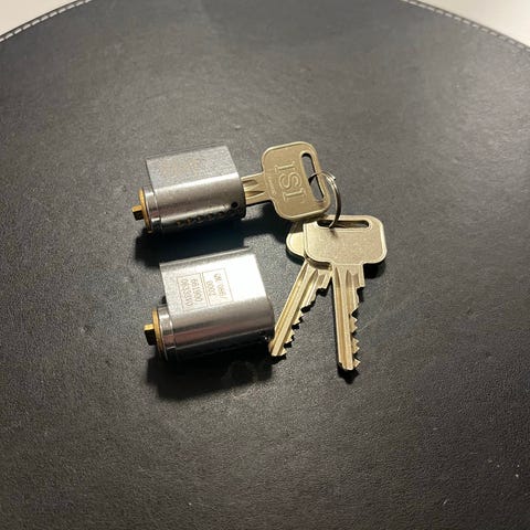Cylindere med nøgler i metal. Sættet består af to cylindere med tilhørende nøgler. Overfladen er i blankt metal. Egnet som reservedele eller udskiftning i kompatible låsesystemer, hvor denne type cylinder passer i dimension og profil. Sælges samlet som vist på billederne.