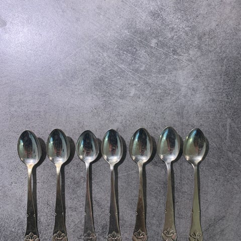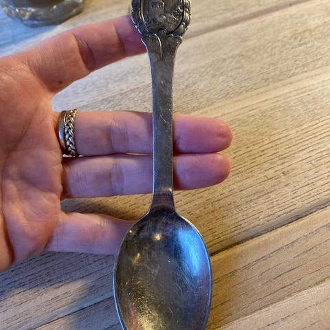 Souvenir teske i metal med guldlook og emaljemotiv i rød og blå på skaftet. Egnet som samlerobjekt eller pynt, f.eks. i vitrineskab eller på vægophæng til souvenirskeer.