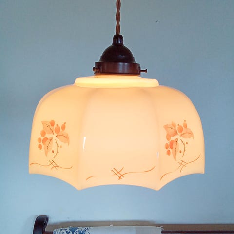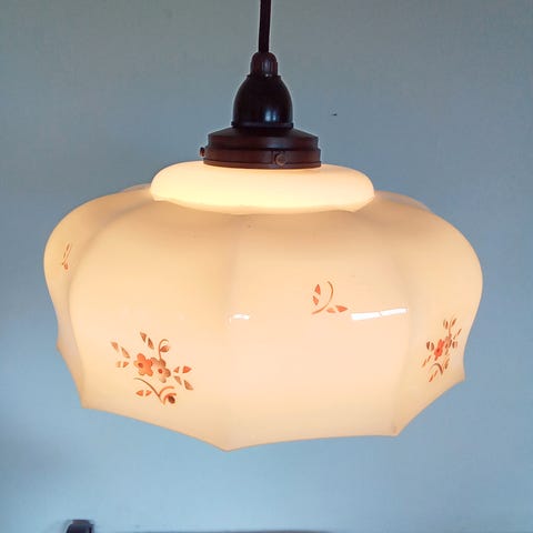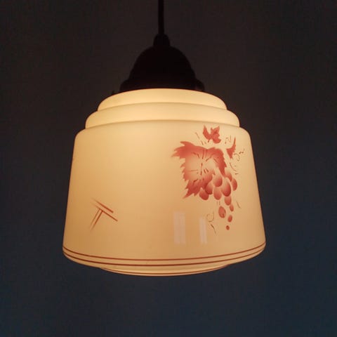 Lampen fremstår i utrolig flot stand, selve glas pendlen er helt uden fejl, slid eller skader, metaldelene har noget naturligt patina.