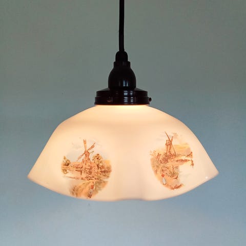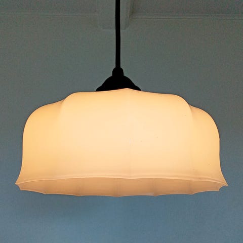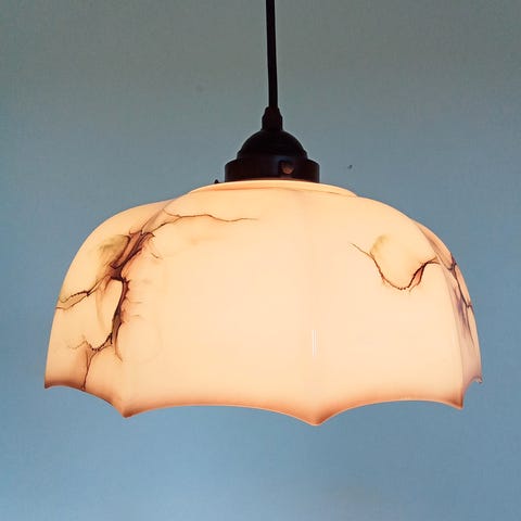Klassisk Art Deco-pendel med en karakteristisk marmoreret glasskærm, sandsynligvis fra perioden omkring 1930'erne til 1940'erne.