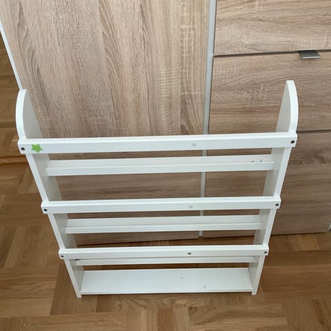 IKEA børnebogreol i hvid med flere rum til opbevaring af bøger og legetøj. Reolen er udformet, så bøgerne står med forsiden udad, hvilket gør det let for børn at se og vælge bøger. Velegnet til børneværelse eller legeområde som praktisk opbevaringsløsning.
