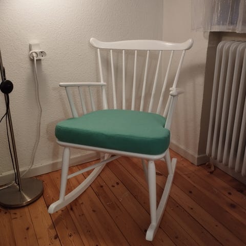 Super hyggelig gyngestol det mangler wirerne i sædet men der er sat en plade i i stedet.