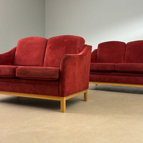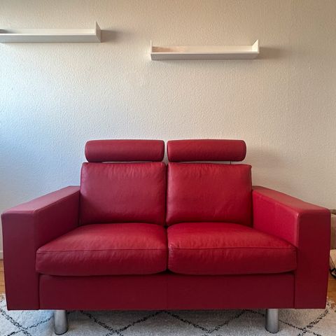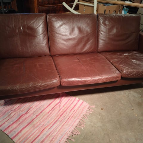 Ikke moderne anilin læder, men den robuste type mange danske møbelfabrikker brugte i 70’erne–90’erne.