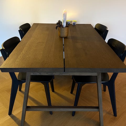 Næsten nyt spisebord 100x220cm fra Kristensen og Kristensen med 50 cm tillægsplade i ASK og 6 st. Veifa spisebordsstole sælges. Det er 1 år gammelt og sælges grundet dødsfald og har en nypris på kr.37.995. sælges samlet for kr. 27.000. Ved hurtig handel kr.25.000 Det fejler absolut ingenting og står som nyt. Kvittering haves.