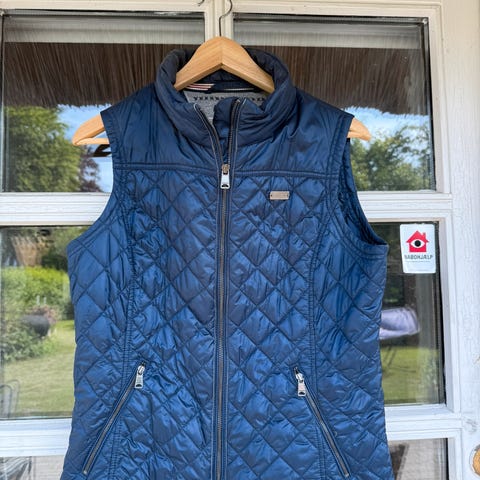 Napapijri quiltet vest til kvinder i str. M. Vesten er fremstillet i nylon og er blå med små prikker. Den har høj krave, gennemgående lynlås foran og sidelommer med lynlås. Indersiden er glatforet, og vesten er let vatteret, hvilket gør den egnet som et ekstra lag over trøjer eller bluser i overgangsvejr.