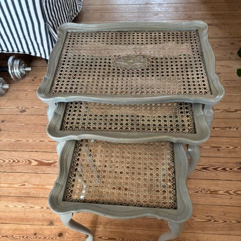 Beskrivelse: 3 elegante indskudsborde i fransk stil. Bordene har flotte detaljer, buede ben og fransk flet under glaspladerne. Perfekte som sideborde eller sofaborde.